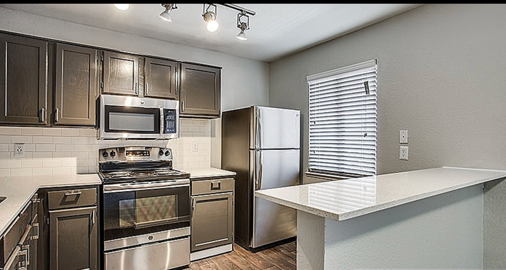 Stylish Finishes: Elegant hardwood-style flooring throughout, vaulted ceilings, and designer track lighting.